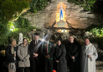 Oliver McCormack and Andrew Osisanya, who are part of the S6 Caritas class, recently attended Carfin Grotto to lead the parishioners in the Holy Rosary